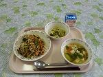 今日の献立は.ごぼうのイタリアンサラダです。ごぼうをしょうゆ,塩,みりん,酒で煮ています。煮たごぼうとコーン,きゅうり,キャベツ,玉ねぎ,ピーマンを混ぜ合わせています。いろいろな味が楽しめるサラダです。