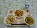 今日の献立は,秋の香りごはんです。秋の食べ物の栗,山菜,しめじと,にんじん,油揚げが入っています。旬の味を楽しんでください。