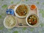今日の献立は,チャプチェです。チャプチェは春雨と細切りにした豚肉とたけのこ,にんじん,玉ねぎ,ほうれん草などの野菜,きのこ類をごま油で炒め合わせて,しょうゆ,食塩,砂糖などで甘辛く味をつけた,韓国料理です。