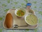 今日の献立は,秋味のクリームシチューです。この時期の秋においしいさつまいも,マッシュルーム,しめじが入っています。いつものシチューはじゃがいもを使っているので,さつまいもの甘みをより感じると思います。皆さん,旬の味を楽しみましょう。