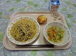 牛乳 しめじの和風スパゲティ 梅ドレッシングサラダ チーズケーキ 大豆小魚