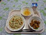 牛乳 冷やしきつねうどん 鶏肉とさつまいもの揚げ煮 フルーツポンチ 大豆小魚