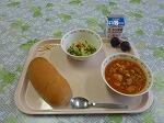 今日の献立は,鶏肉と豆のトマト煮です。玉ねぎ,にんにく,じゃがいも,鶏肉と豆はひよこ豆,えんどう豆,いんげん豆が入っています。豆は栄養がぎゅっとつまっています。トマト味なので,食べやすいと思います。