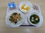 牛乳 チンジャオロース丼 にら卵スープ 杏仁豆腐 大豆小魚