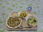 牛乳 ひじきとベーコンのピラフ じゃがいもの味噌サラダ チキンヌードルスープ アーモンド