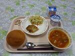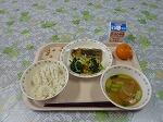 今日の献立は,チキンヌードルスープです。鶏肉,スパゲティ,牛乳,玉ねぎ,にんじん,ほうれん草が入っています。油とバター,小麦粉でルぅを作っているので,こくのあるスープです。