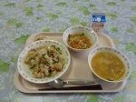 今日の献立は,ジャージャーめんです。ジャージャーめんは中国料理の一つで,豚ひき肉とみじん切りにした野菜を炒めてとうばんじゃん,てんめんじゃんなどで調味した肉みそをゆでた中華麺に乗せたものです。給食ではたまねぎ,にんじん,ピーマン,ねぎ,干ししいたけ,豚肉,大豆を具にしています。