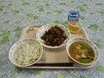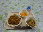 今日の献立は,韓国料理です。韓国で有名な肉料理のプルコギ,甘めの味です。今日はごはんに混ぜて出します。スープは韓国特産のキムチ,韓国のおもち,トックを入れています。