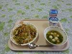 牛乳 回鍋肉丼 青梗菜のスープ ヨーグルト アーモンド
