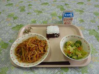 牛乳 ツナとトマトのスパゲティ にんにくドレッシングサラダ はらぺこあおむしのチョコレートケーキ 小魚