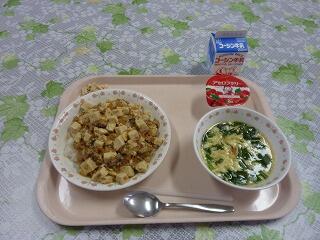牛乳 麻婆豆腐丼 にら卵スープ アセロラゼリー アーモンド