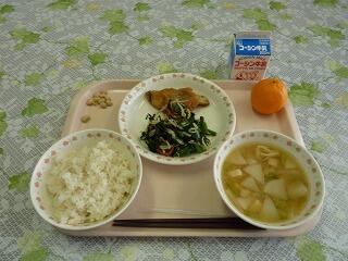 牛乳 ごはん 鯖のおろし煮 のりあえ かぶの味噌汁 ぽんかん 炒り大豆
