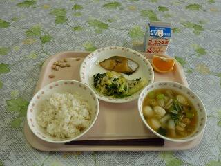 牛乳 ごはん 鰆のゆず味噌かけ からしあえ よせなべ汁 清見オレンジ 炒り大豆