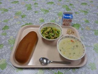 牛乳 はちみつパン かぶと青大豆のクリームシチュー エリンギサラダ アーモンド