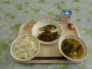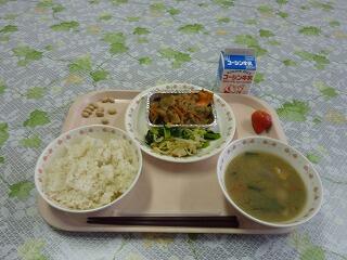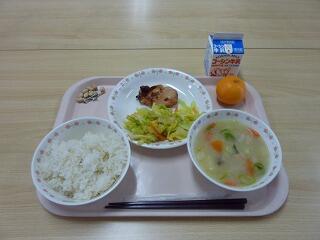 牛乳 ごはん 鶏肉のもろみ焼き 白菜のおひたし 石狩汁 ぽんかん 大豆小魚