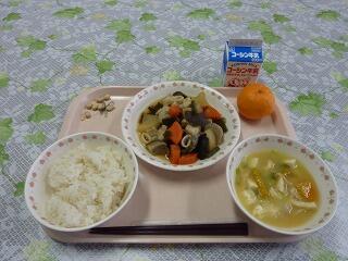 牛乳 ごはん いかとだいこんの炒め煮 かぼちゃの味噌汁 ぽんかん 大豆小魚