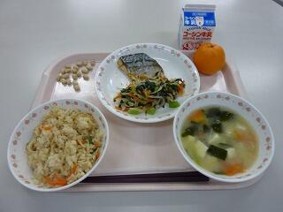 牛乳 切干し大根ごはん 鯖の照り焼き 磯香あえ じゃがいもの味噌汁 ポンカン 炒り大豆