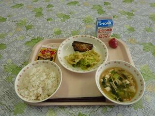 牛乳 ごはん 鰯の甘露煮 菜の花のおひたし えのきたけの味噌汁 いちご 福豆