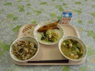 今日の献立は,切干し大根ごはんです。具は切干し大根と油揚げ,たけのこ,にんじん,いんげんです。しっかり味をつけているので,ごはんに合います。