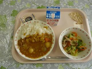 牛乳 エッグカレーライス しめじ入りサラダ アーモンド プルーン