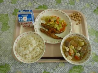 牛乳 ごはん ししゃもの香味ソース 白菜のおひたし 豚汁 きなこ大豆