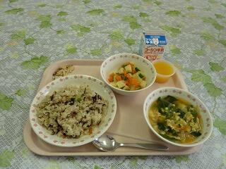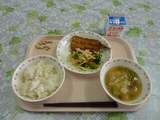 牛乳 ごはん 鰯の蒲焼き こまつなのおひたし なめこ汁 炒り大豆