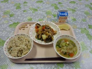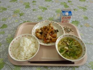 牛乳 ごはん 厚揚げの味噌炒め チンゲンサイのスープ りんご 小魚