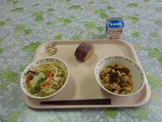 牛乳 力うどん 五目豆 焼きいも アーモンド小魚