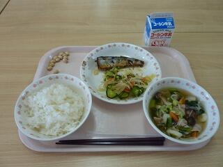 牛乳 ごはん さんまのにんにく味噌煮 きゅうりのゆず和え いもに汁 炒り大豆