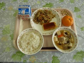 牛乳 ごはん いかのくわ焼き じゃがいもの金平煮 けの汁 みかん 炒り大豆