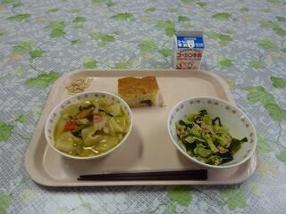 牛乳 ほうとう ツナとわかめのあえもの 和風ホットケーキ アーモンド