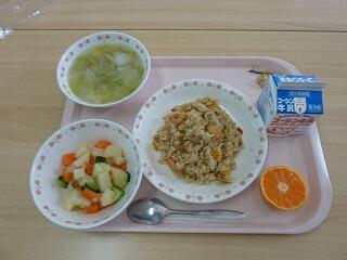 牛乳 ナシゴレン マセドアンサラダ かぶのスープ みかん 大豆小魚