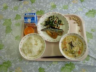 牛乳 ごはん さんまの筒煮 磯香あえ むらくも汁 みかん 炒り大豆