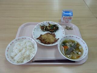 牛乳 ごはん 豚肉のごま味噌焼き 磯香あえ けんちん汁 小魚