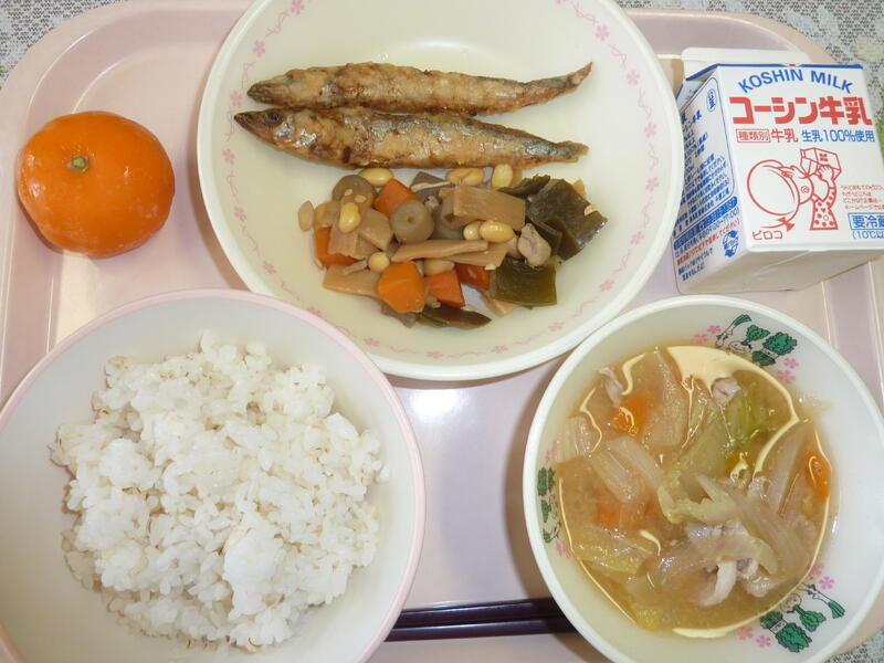 本日の献立は、ごはん、ししゃもの唐揚げ、五目煮、胡麻仕立てのみそ汁、冷凍みかん、牛乳です。