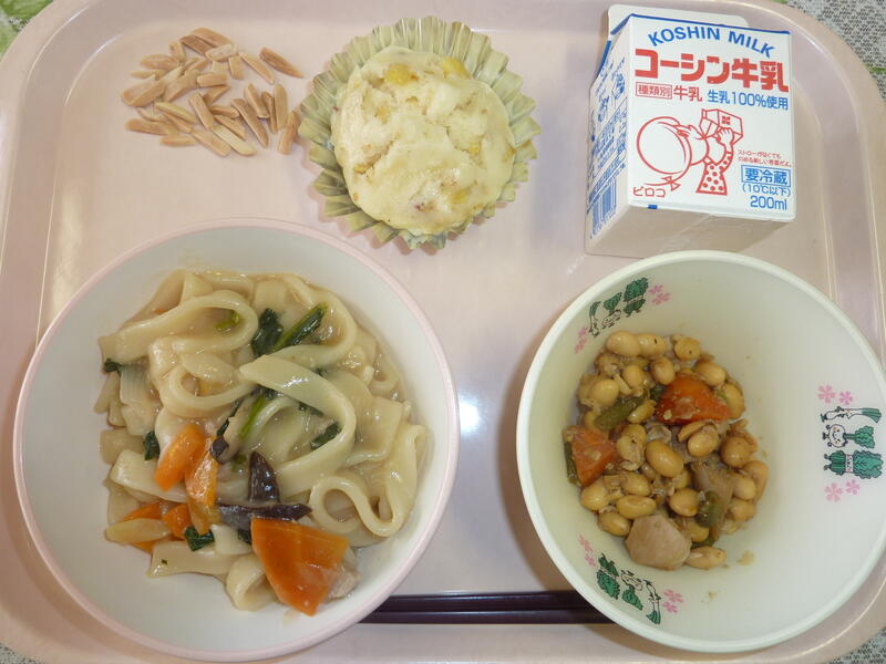 本日の献立は、味噌きしめん、大豆と鶏肉の甘辛煮、さつま芋入り蒸しパン、アーモンド、牛乳です。