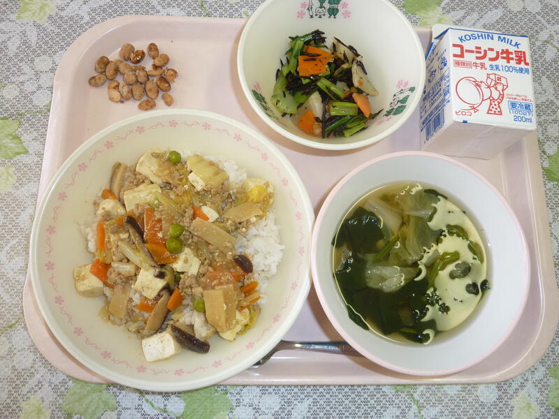 本日の献立は、ごはん、豆腐のカレー煮、柏野菜とひじきの和え物、うずらの卵入りすまし汁、黒糖ビーンズ。牛乳です。