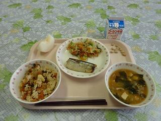 牛乳 栗ごはん さんまの塩焼き こまつなのおひたし 豆腐とわかめの味噌汁 梨 炒り大豆