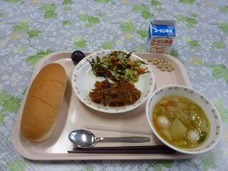 牛乳 ミルクパン メルルーサのきのこソースかけ キャベツと昆布のレモンあえ ペイザンヌスープ 巨峰 炒り大豆