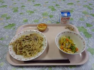今日の献立は,しめじの和風スパゲティです。しめじは秋の味覚です。しめじの栄養としては,病気にかかりにくくなり,疲れをとってくれ,骨を丈夫にしてくれる働きがあります。しょうゆ味の和風な味付けにチーズ,バターを使い,こくを出します。