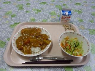 今日の献立は,明日が運動会なのにちなんで,カツカレーライスを出します。豚のヒレ肉を揚げたカツをひき肉を使ったカレールゥをかけて食べます。皆さん明日はがんばってくださいね。
