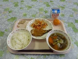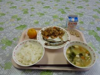 牛乳 ごはん ししゃも焼き 切干し大根のうま煮 じゃがいもの味噌汁 冷凍みかん 炒り大豆