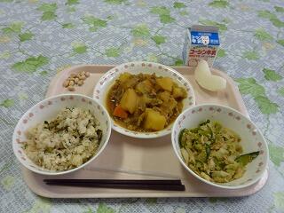 牛乳 野沢菜じゃこごはん カレー肉じゃが キャベツときゅうりの胡麻酢あえ 梨 炒り大豆