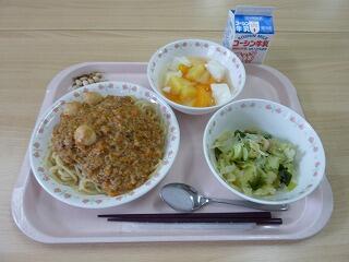 牛乳 ひじきの南仏風混ぜごはん マセドアンサラダ チーズスープ アップルシャーベット アーモンド