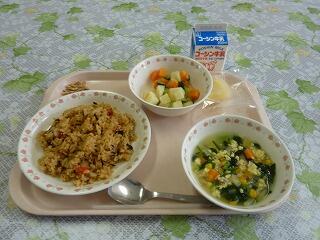 今日の献立は,ひじきの南仏風混ぜごはんです。具は鶏肉,たまねぎ,ピーマン,ひじき,にんにくで塩,こしょう,ケチャップで味をつけて煮て,ごはんに混ぜています。