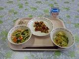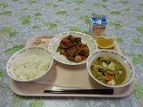 今日の献立は,どんどろけめしです。どんどろけめしは,鳥取県の郷土料理です。「どんどろけ」とは方言で雷のことをさします。豆腐を炒めるときのバリバリという音が雷に似ていることからこの名前がつきました。中部から東部にかけての山村で普及し,農作業の節目や集落の集まりなfどに作られていました。