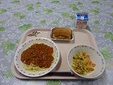 牛乳 スパゲティミートソース コーンサラダ アップルパイ 小魚