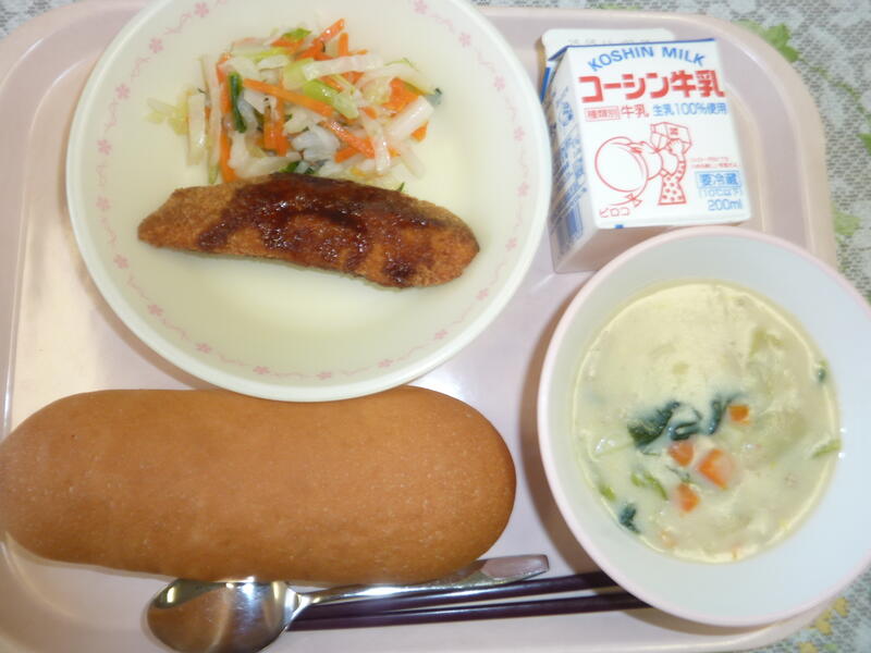 本日の献立は、コッペパン、鮭フライ、ハチミツ入りドレッシングサラダ、米粉シチュー、牛乳です。