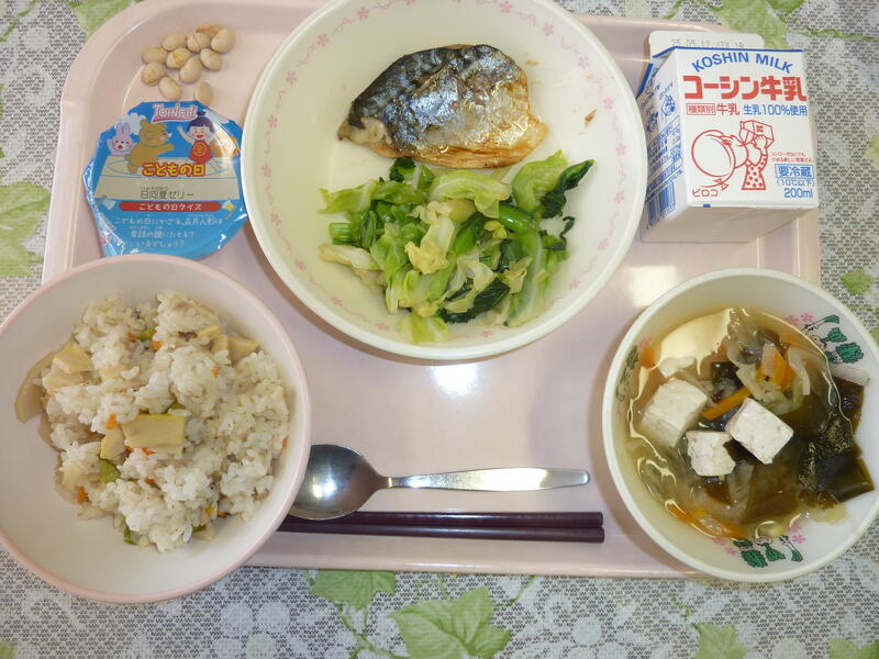 本日の献立は、たけのこご飯、サバの山椒焼き、ピリ辛あえ、切り干し大根の味噌汁、こどもの日日向夏ゼリー、炒り大豆、牛乳です。