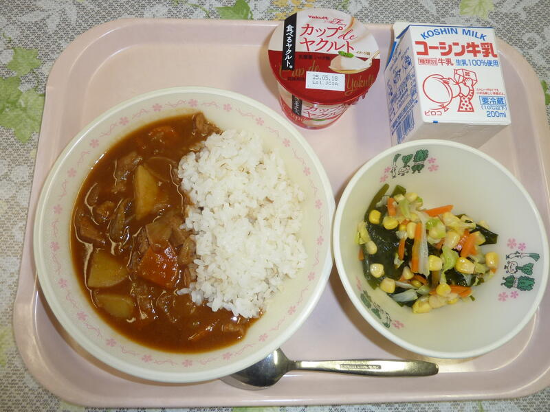 本日の献立は、ポークカレーライス、わかめとコーンのサラダ、ヨーグルト、牛乳です。